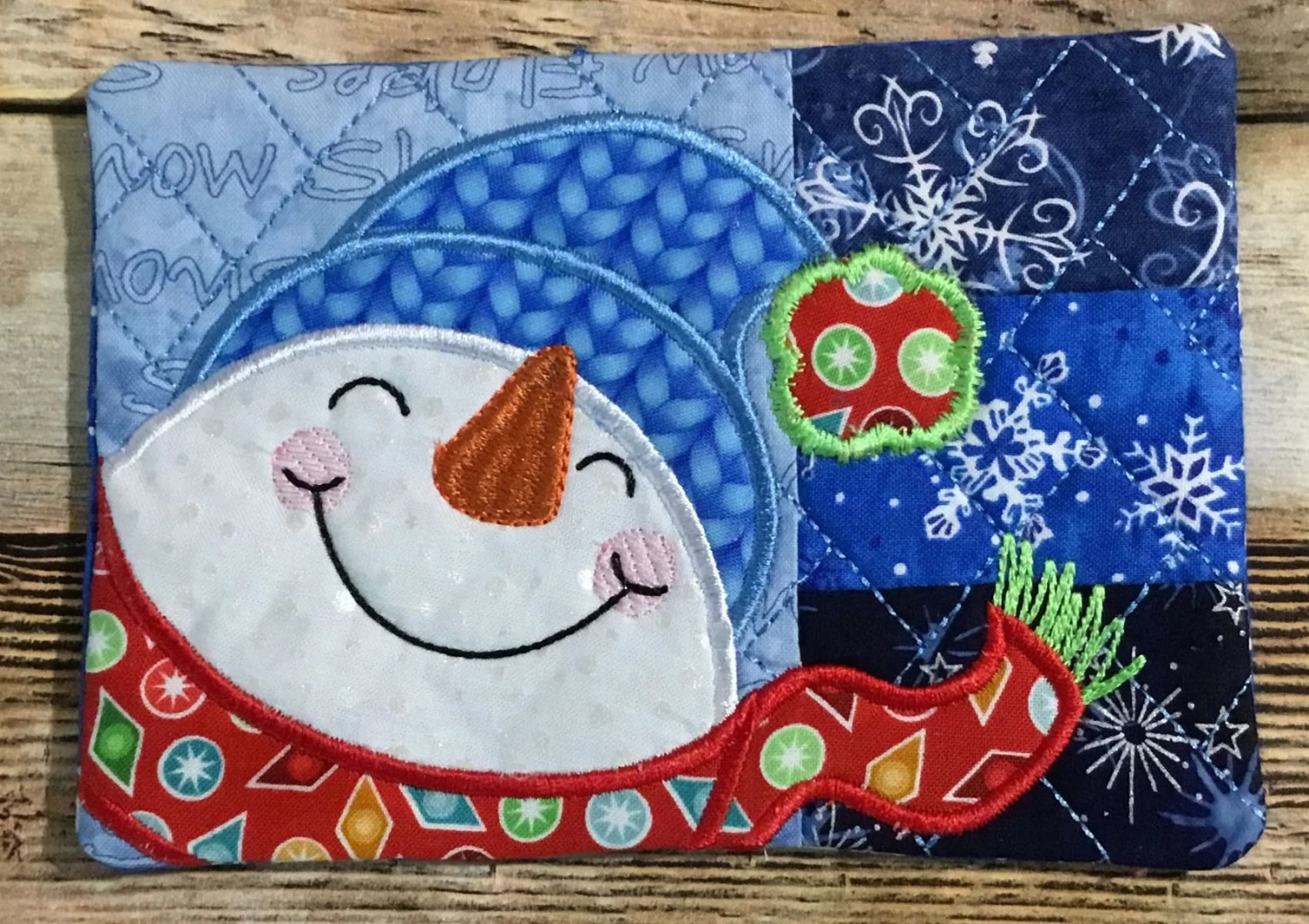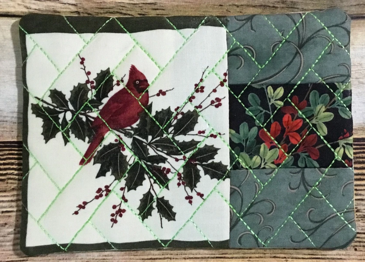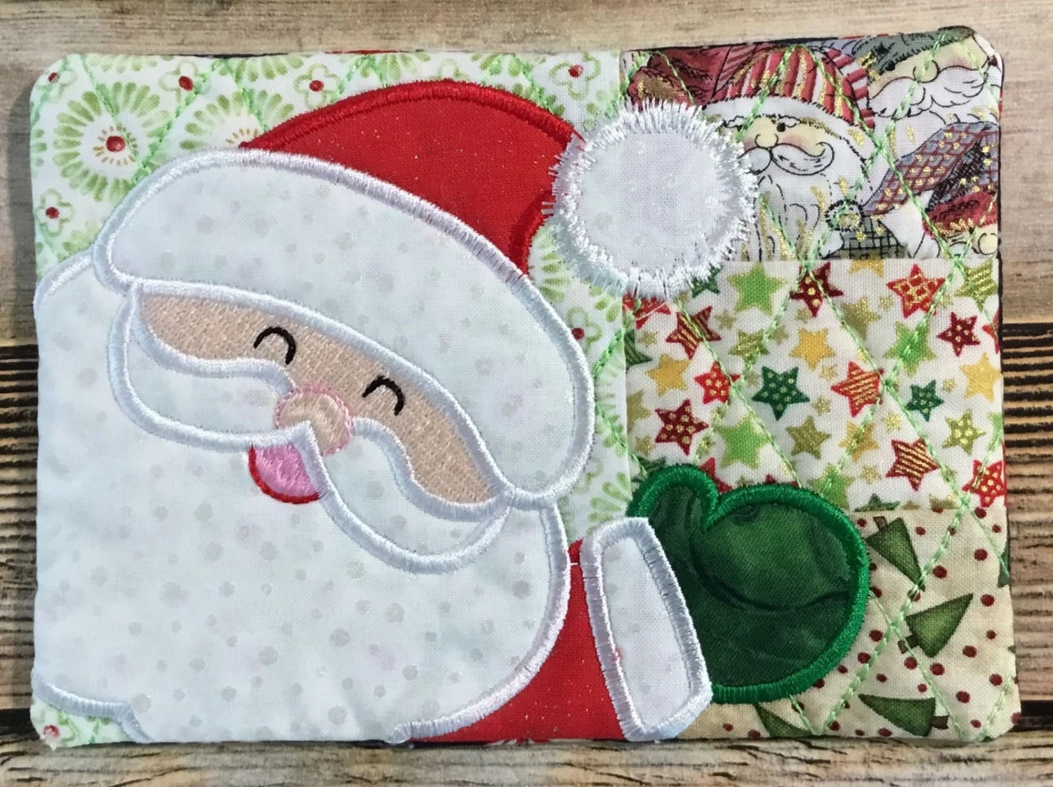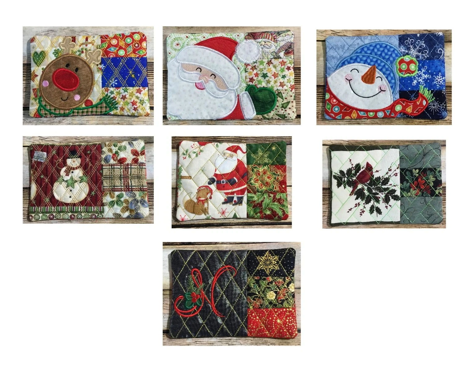 Three precious patchwork mug rugs with Christmas appliques! These are made *completely* in the hoop and are very easy to make. We include excellent step by step photo instructions as well! The mug rugs are also quilted!
