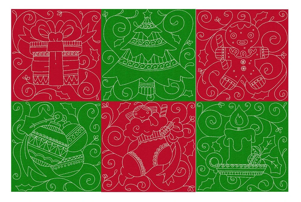 6 Beautiful Christmas themed quilt blocks in single and triple stitch