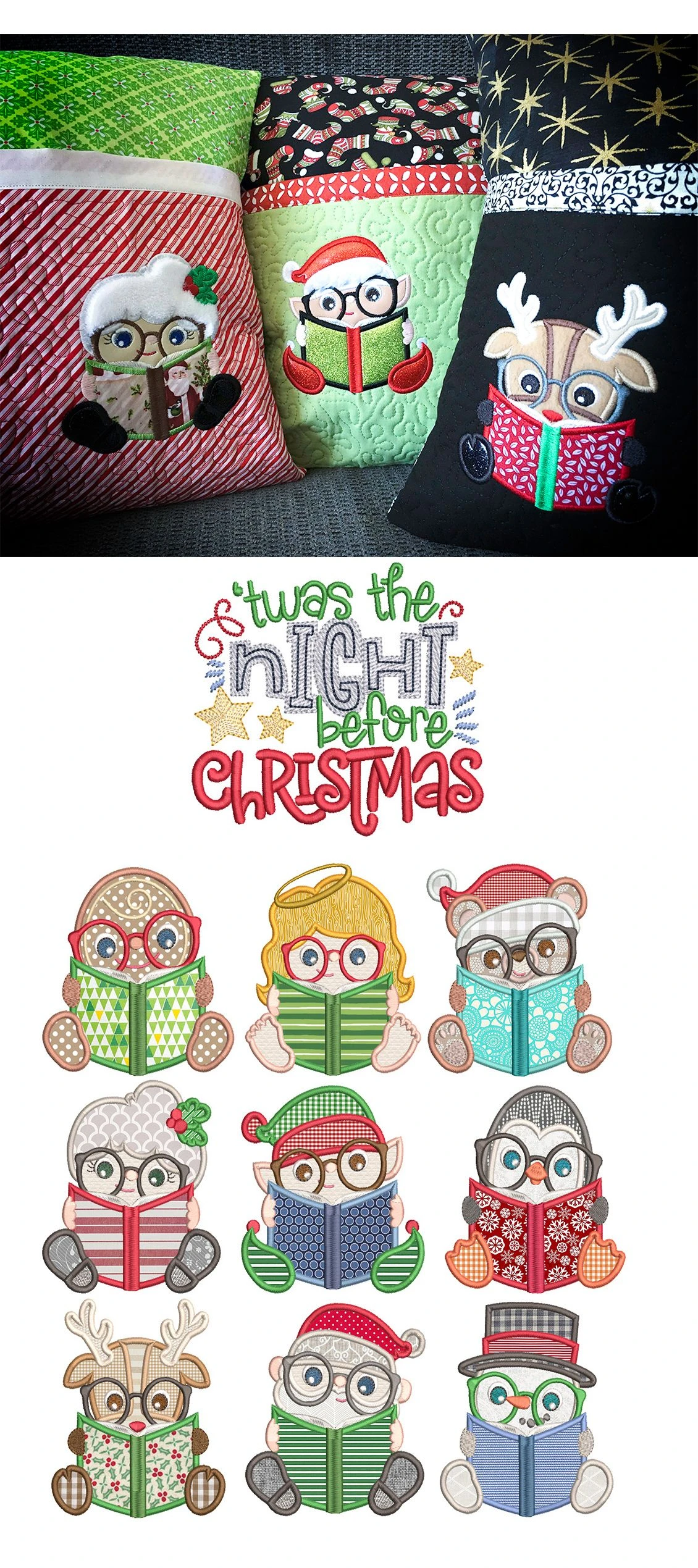 9 super cute reading Christmas peeps in applique!