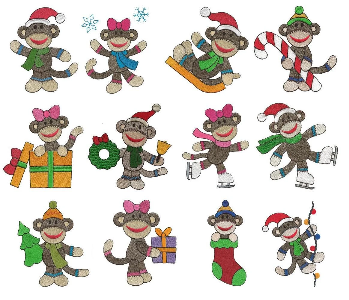 They’re here! We promised a Christmas sock monkeys set in filled stitch and we are pleased to bring you these 12 adorable Christmas themed designs. We use Floriani “fufu” 11 and 12 for the twist thread of the monkeys bodies. 🙂