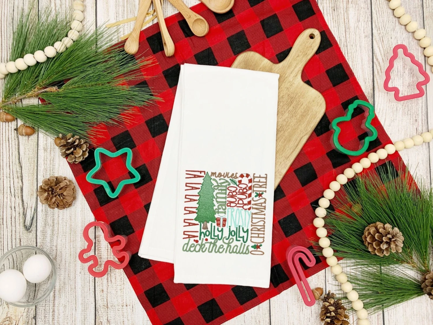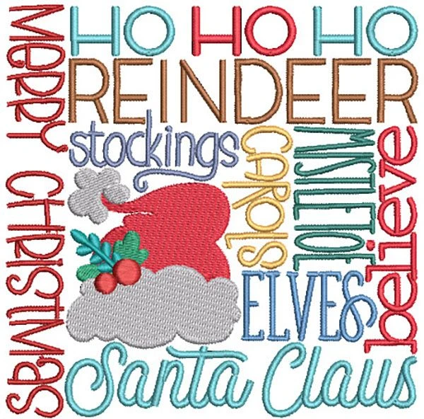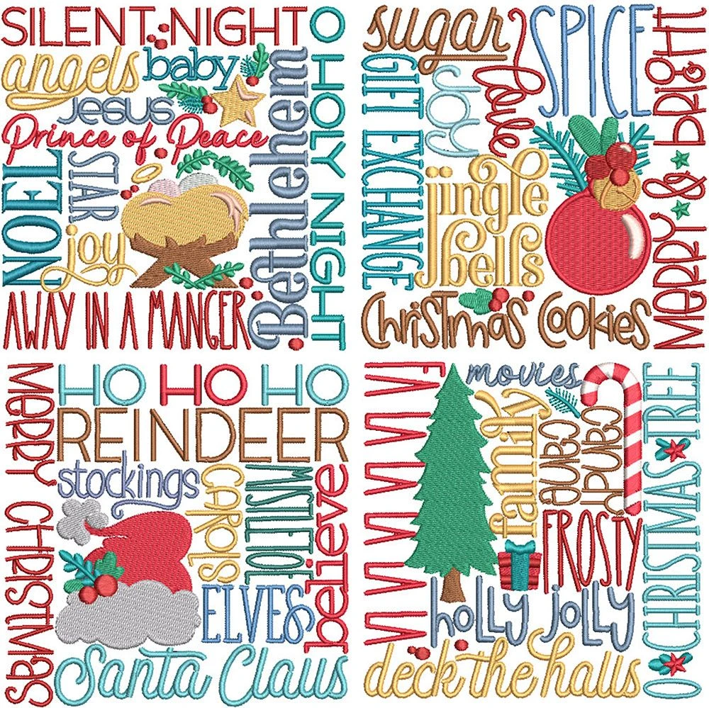 4 super festive Christmas subway art designs! These embroidery-only designs have satin stitch lettering with satin and fill stitch design accents.