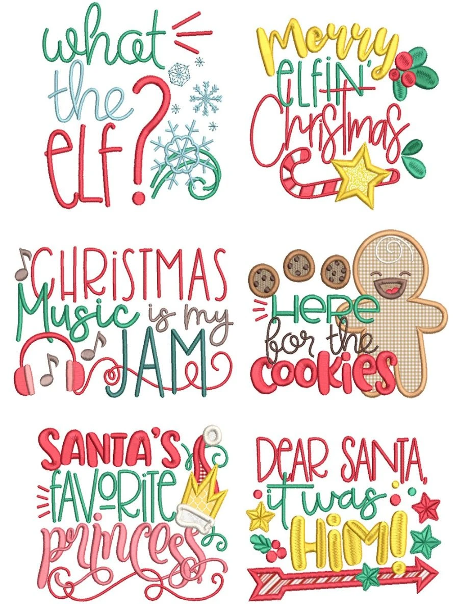 *Please note that the following designs contain applique components: Merry Elfin’ Christmas / Here for the cookies / Santa’s favorite princess / Dear Santa, it was him!