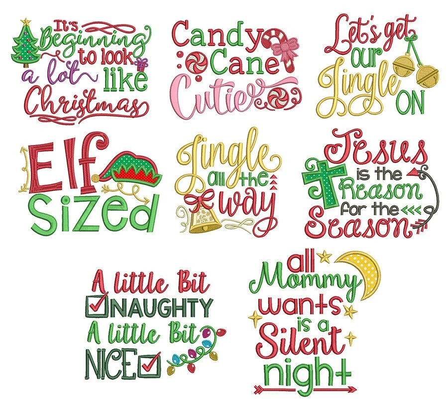 8 super adorable Christmas word art designs. This is the first of a 4 set series. *Please note that the following designs contain applique components: It’s beginning to look a lot like Christmas / Elf sized / Jingle all the way / Jesus is the reason for the season / all mommy wants is a silent night /