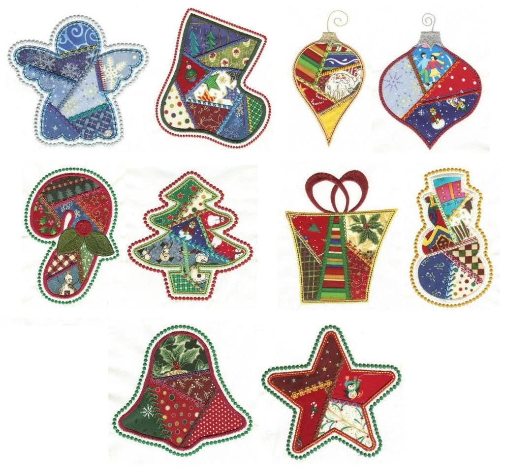10 beautiful “crazy patchwork” style Christmas motifs in applique. Great for quilts, wallhangings, totes, towels, tree skirts, sweatshirts and more!