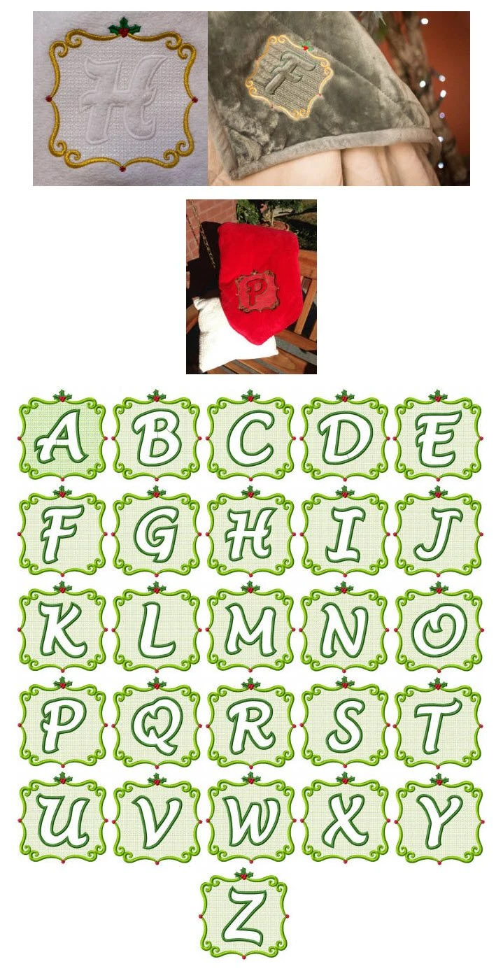 This is a beautiful embossed monogram perfect for elegant Christmas items with it’s pretty scrolled frame and holly leaves. I love to stitch it using metallic thread for the frame and tone on tone for the letter. So pretty!