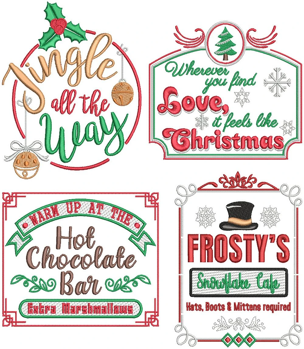 4 more beautiful farmhouse style Christmas designs! These designs are embroidery-only with satin stitch lettering and a mix of satin, fill and bean stitch design elements. Please note the banners feature a light and airy sketch fill pattern behind the text.