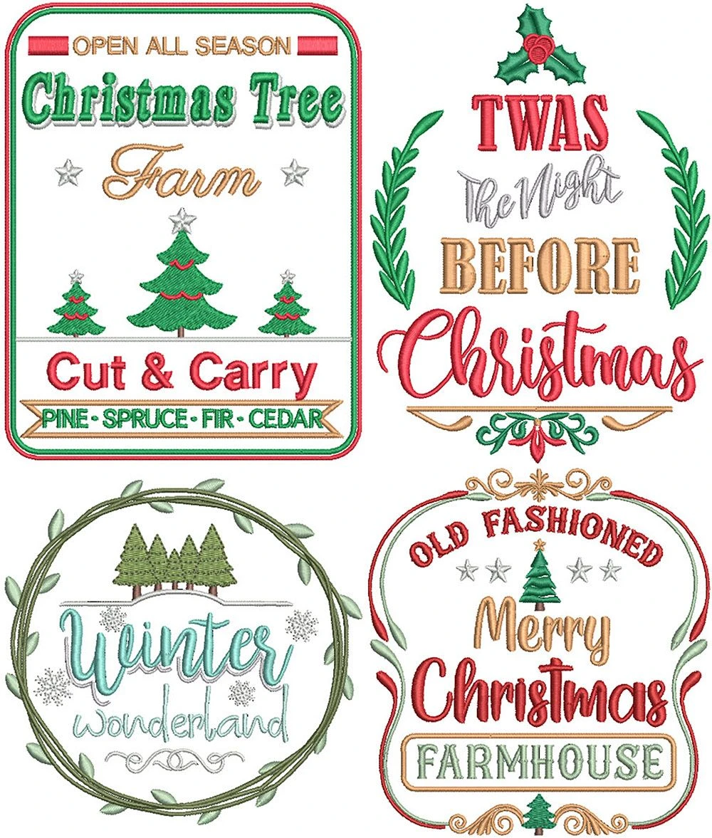 4 more beautiful farmhouse style Christmas designs! These designs are embroidery-only with satin stitch lettering with satin and fill stitch design elements.