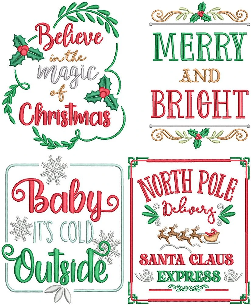 4 more beautiful farmhouse style Christmas designs! These designs are embroidery-only with satin stitch lettering with satin and bean stitch design elements.