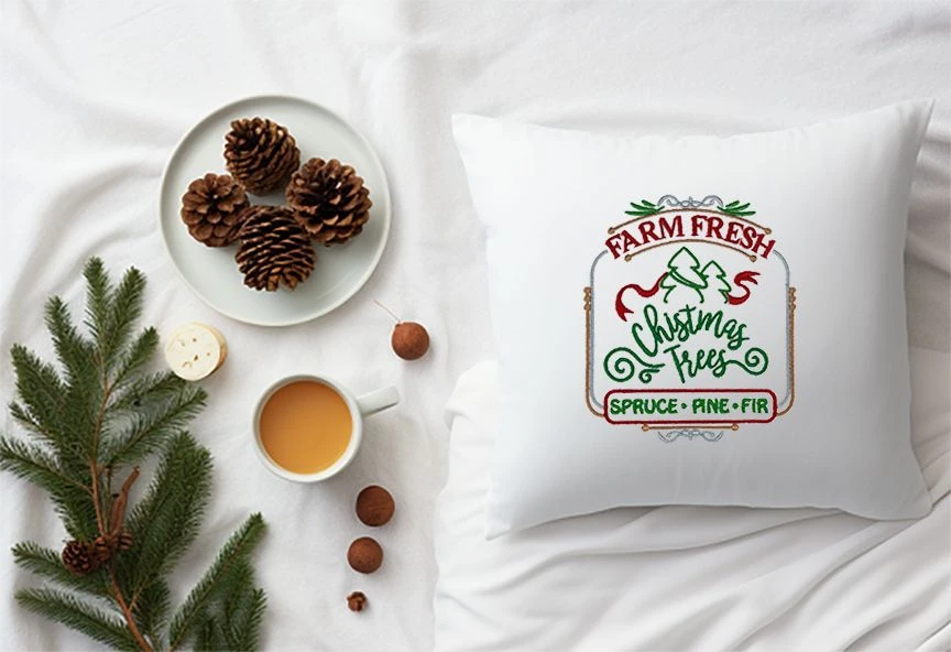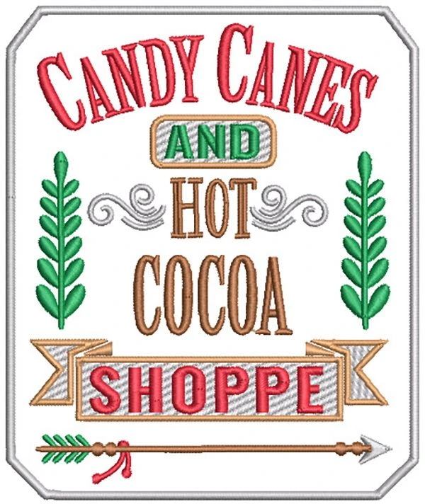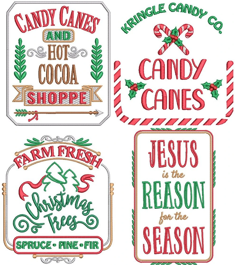 4 more beautiful farmhouse style Christmas designs! These designs are embroidery-only with satin stitch lettering and design elements. The “Candy Canes and Hot Cocoa Shoppe” design features sketch fill banners.