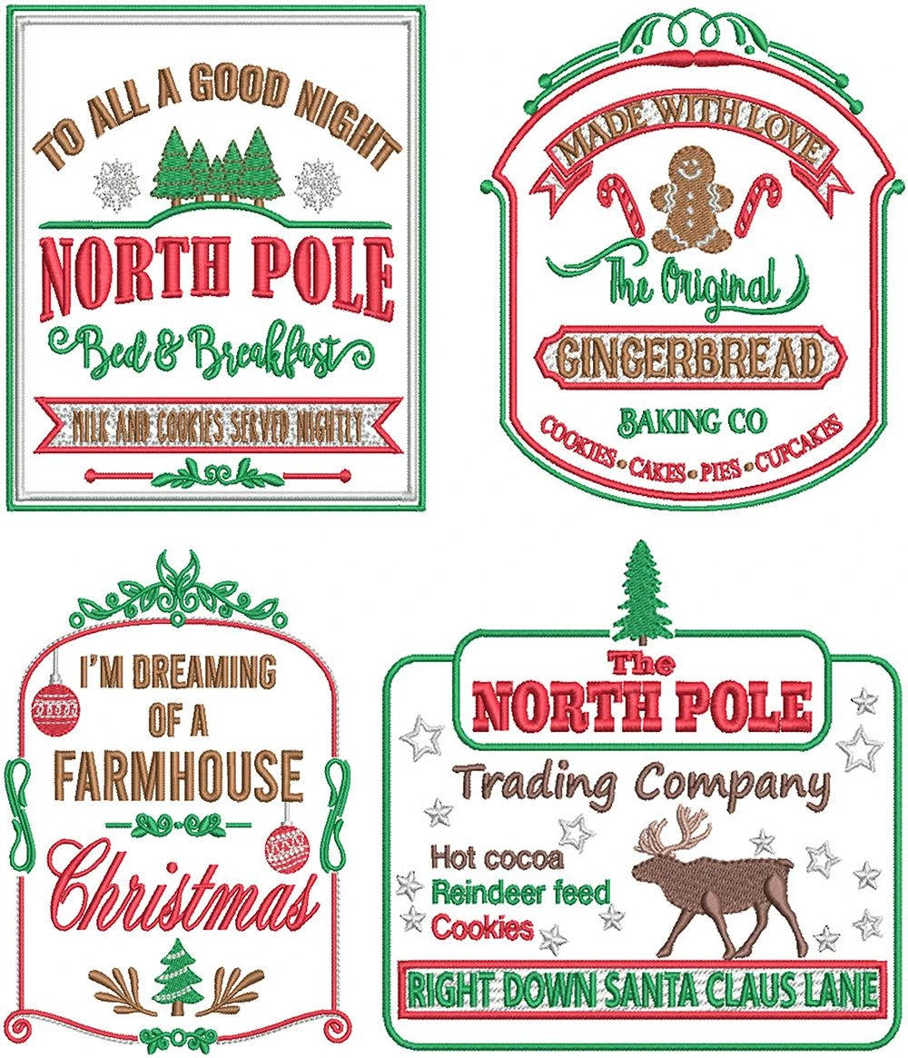 4 more beautiful farmhouse style Christmas designs! These designs are embroidery-only with satin stitch lettering and a