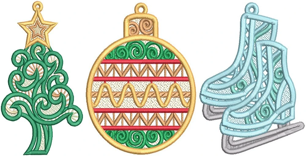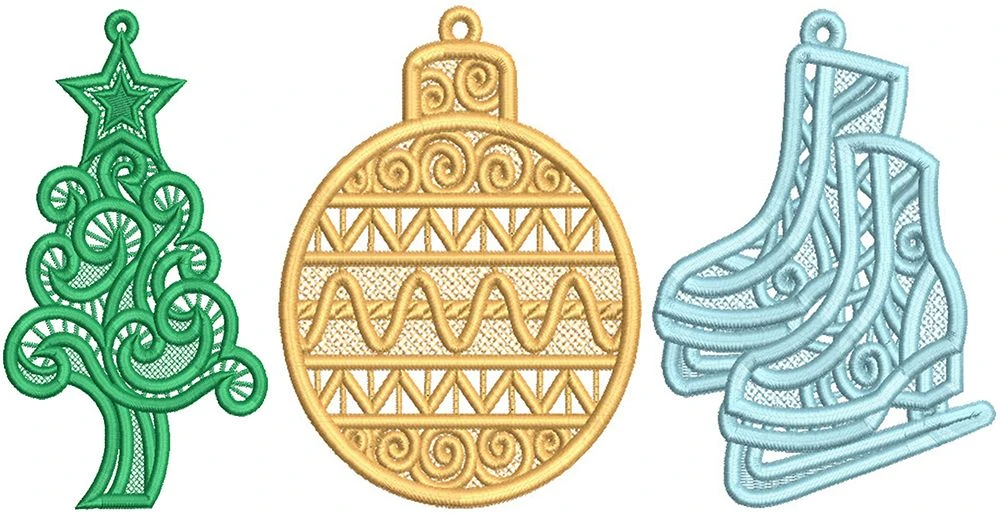 3 elegant free standing lace Christmas designs! Includes option for single or multiple thread colors. Stitch these beautiful lace designs onto a non-woven fiber mesh water soluble stabilizer such as Sulky Fabri-Solvy then gently rinse to leave only the thread, creating these beautiful free standing lace designs.