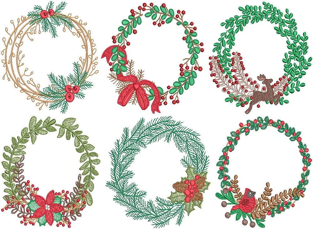 6 beautifully rustic Christmas inspired wreaths! These designs are embroidery-only featuring a mix of satin, sketch, bean and fill stitch details.