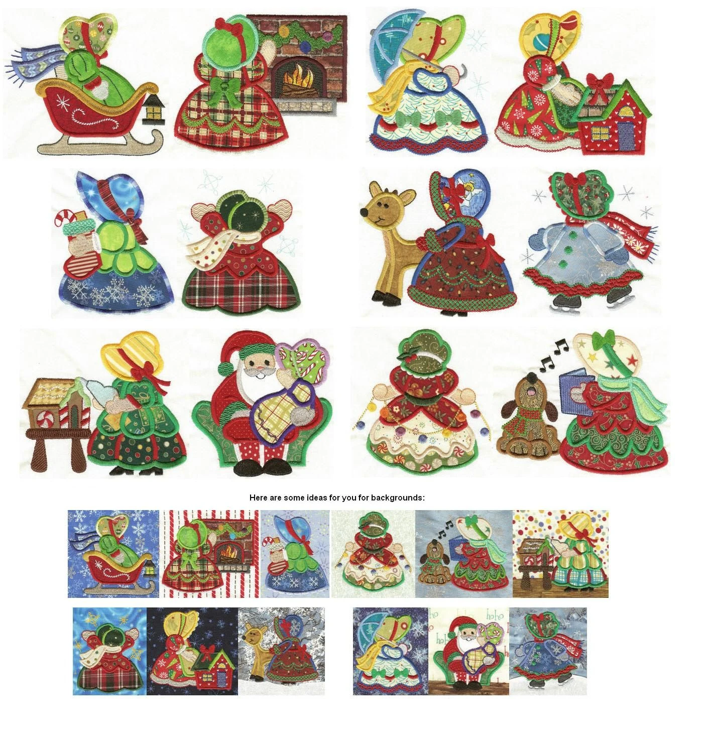 If you are a sunbonnet lover, then you will simply adore our newest set of Christmas sunbonnet belles! These simply darling sunbonnet sues are brought to you just in time for the holidays and are sure to bring joy to your holiday sewing! My very talented and creative tester, Margie, sewed out the smaller ones on different Christmas backgrounds, and they look adorable. I have included these photos below as well!