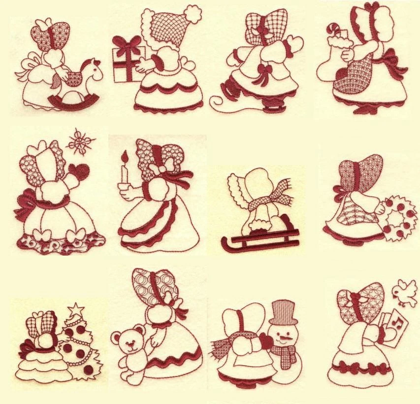 Here are some wonderful, quick, and effective sunbonnets in redwork for all of you Sunbonnet Sue lovers!